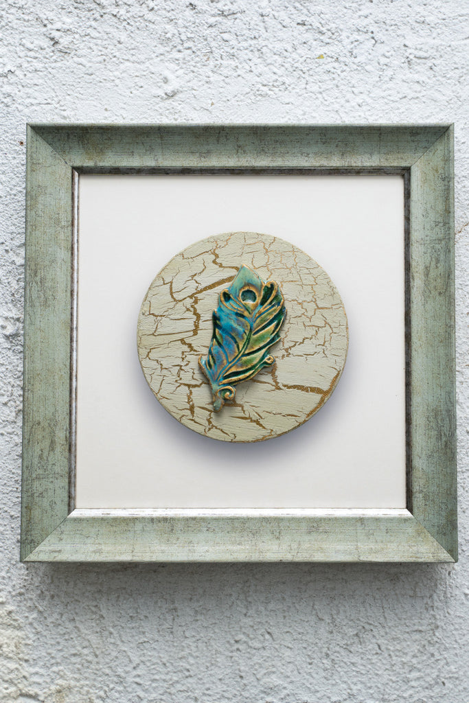 Inspired by the timeless beauty of the Indian peacock, the Azure Feather Medallion brings a touch of nature’s grace into your home. A single, hand-glazed feather in vibrant shades of blue and green rests upon a circular, crackled base, creating a beautiful contrast between rustic texture and refined artistry. Framed in distressed sage green, this piece symbolizes lightness and renewal, making it a captivating focal point for any room.