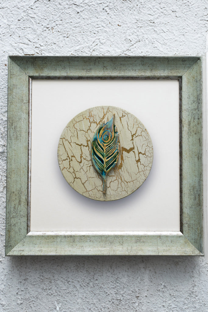 Inspired by the timeless beauty of the Indian peacock, the Azure Feather Medallion brings a touch of nature’s grace into your home. A single, hand-glazed feather in vibrant shades of blue and green rests upon a circular, crackled base, creating a beautiful contrast between rustic texture and refined artistry. Framed in distressed sage green, this piece symbolizes lightness and renewal.