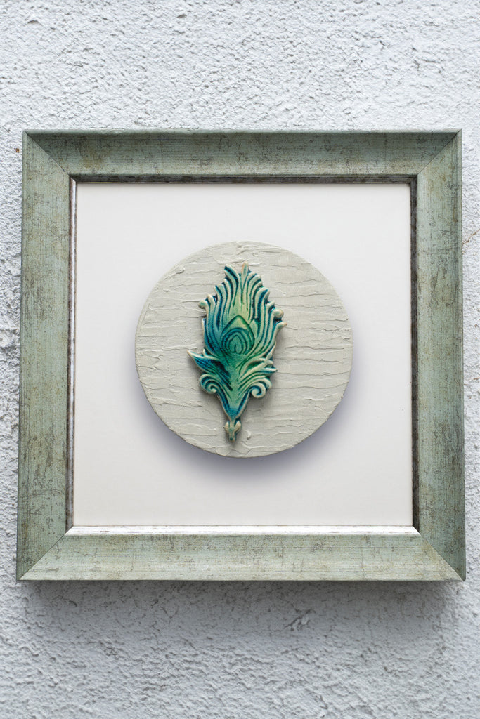 A modern tribute to the peacock’s splendor, the Emerald Plume Medallion features an elegantly stylized feather, hand-glazed in rich emerald and teal tones. Set against a textured, neutral medallion and framed in distressed sage green, this piece blends vibrant color with rustic charm. It symbolizes grace and heritage, reimagined for contemporary spaces.