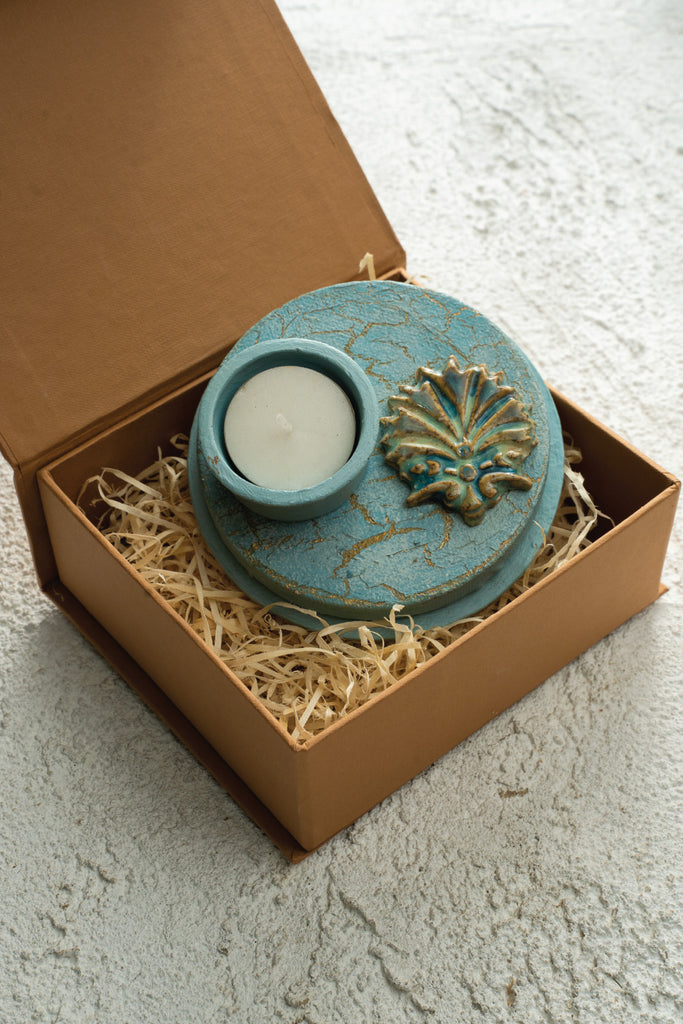Create a tranquil ambiance with the Serene Leaf Tealight Holder. This piece features a beautifully sculpted ceramic leaf with gilded accents, resting on a rustic, double-tiered canvas base. The distressed aqua finish evokes the calm of coastal waters, making it a perfect accent for adding a soft, warm glow to any tabletop or shelf. Thoughtfully packaged in a simple craft box with natural fiber bedding, it makes an ideal gift for any occasion.