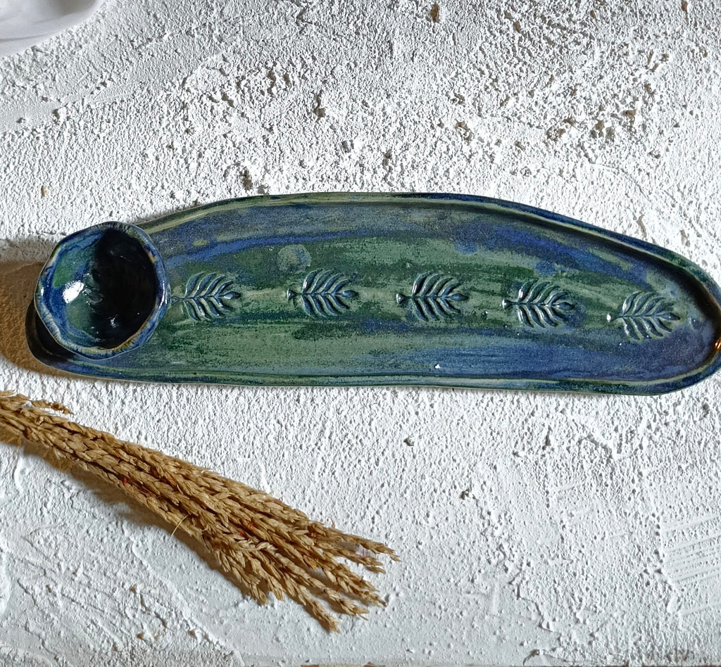 This textured platter is fully hand built. As this is handmade it is slightly organic in nature . Each piece is hand glazed, hence might have the maker's finger imprint marks. All the pieces are high fired and microwave friendly !\n\nMaterial : Stoneware Clay, food safe lead-free glaze\n\nMeasurements: 33.7cmx 09cm