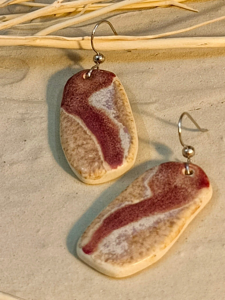 Our Jewellery is made from stoneware.Its rolled, carved, textured, bisqued and glazed.These go throughÊ firings twice and the temperature is as high as 1200 ¡C.