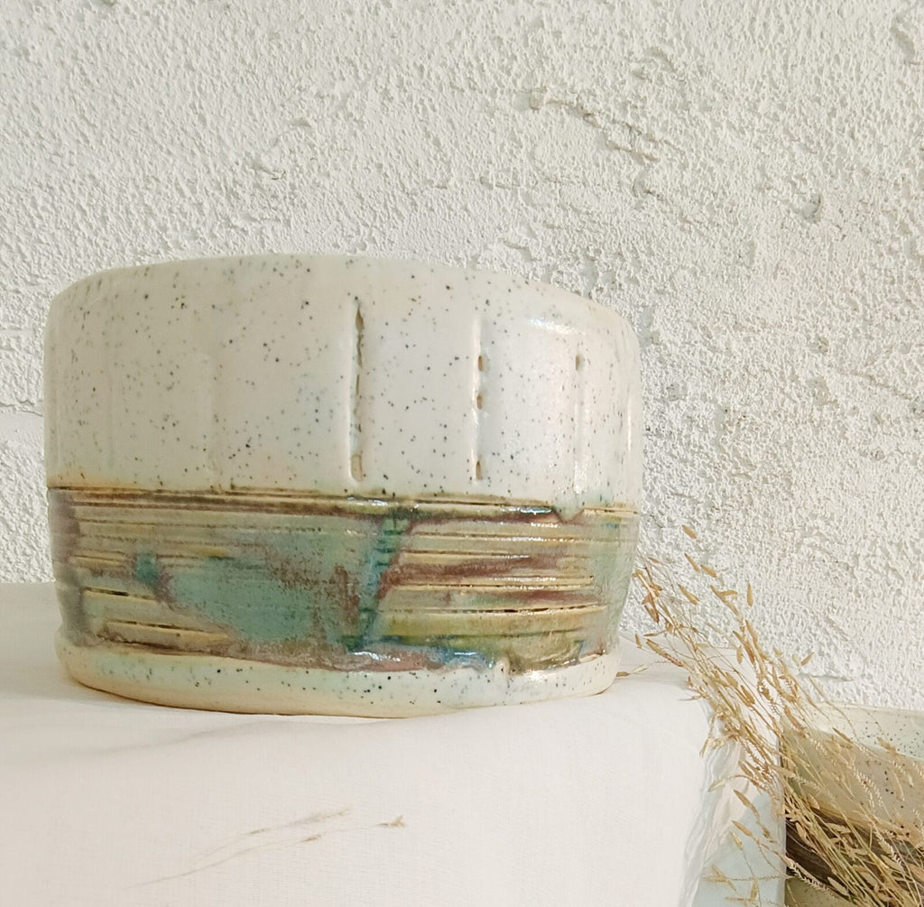 Wheel thrown flower pot in stoneware ,this is a simple and classy piece for those classy interiors and for your greens....The glazes used are a beautiful speckled Matt satin glaze with a dash of stains and textures....A stunning contrast.