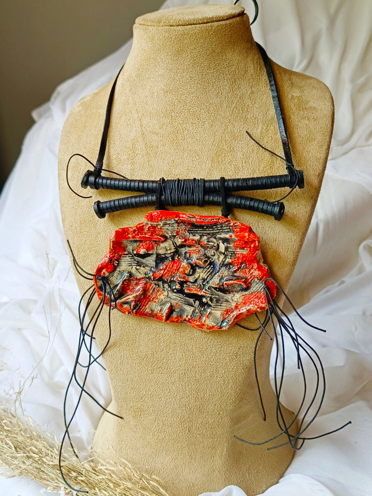 Our Jewellery is made from stoneware.Its rolled, carved, textured, bisqued and glazed.These go throughÊ firings twice and the temperature is as high as 1200 ¡C.