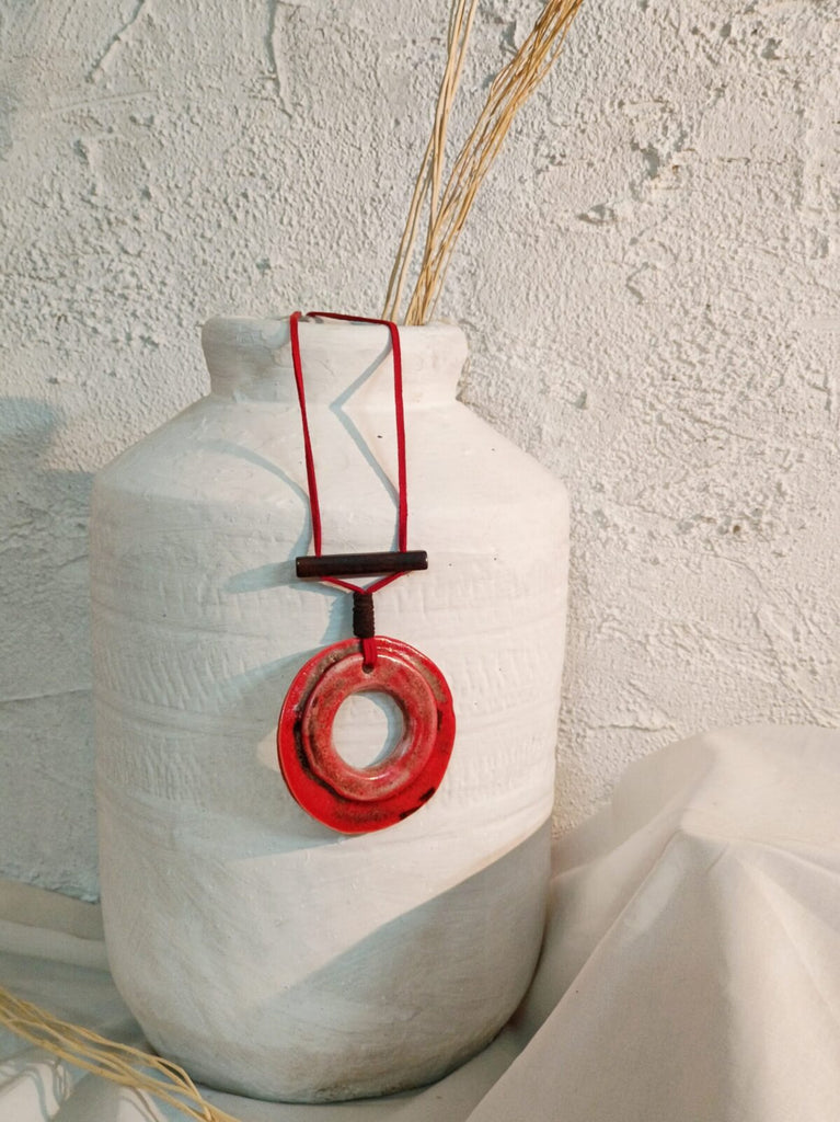Our Jewellery is made from stoneware.Its rolled, carved, textured, bisqued and glazed.These go throughÊ firings twice and the temperature is as high as 1200 ¡C.