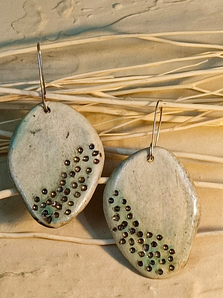 Our Jewellery is made from stoneware.Its rolled, carved, textured, bisqued and glazed.These go throughÊ firings twice and the temperature is as high as 1200 ¡C.