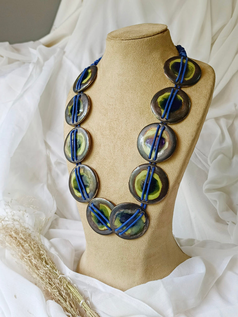 Our Jewellery is made from stoneware.Its rolled,carved, textured, bisqued and glazed.These go throughÊ firings twice and the temperature is as high as 1200 ¡C. \n \nThese pieces are adorned with different threads and embellishments and color may vary from screen to screen. \n \nThere might be metallic attachments at the back keeping the design aesthetics in mind. \n \nMost of the rings and earrings have a resin covering at the back to avoid the rough surface associated with ceramics.