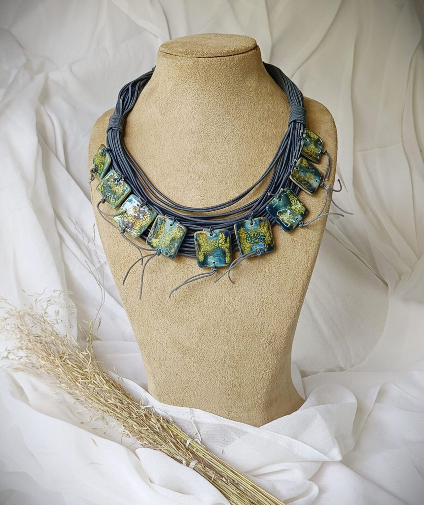 Our Jewellery is made from stoneware.Its rolled, carved, textured, bisqued and glazed.These go throughÊ firings twice and the temperature is as high as 1200 ¡C.