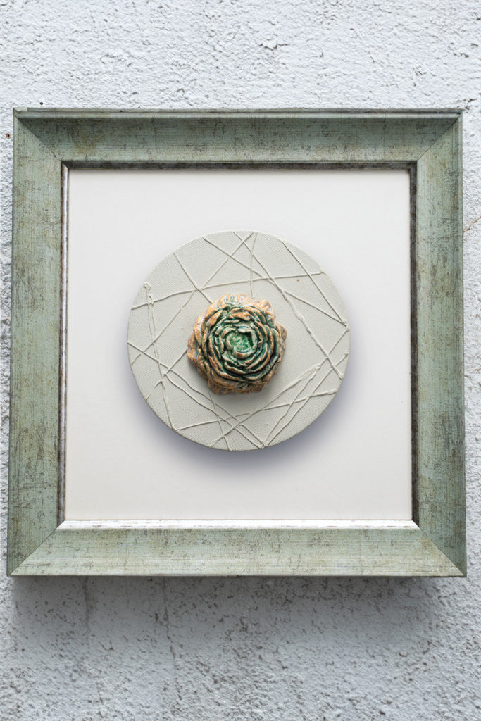 Capturing the essence of a garden in bloom, the Verdant Rose Medallion features a beautifully sculpted rose with a soft green and gold patina. The flower is centered on a neutral disc with abstract line details, blending natural form with modern design. Framed in distressed sage, this artwork is a gentle reminder of growth and life’s quiet elegance.